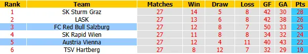 Thất bại bất ngờ 0-2 trước chính đối thủ này trên sân nhà hồi tháng 2 là một cú sốc lớn đối với Red Bull Salzburg. Tuy nhiên, Salzburg đã kịp đòi lại món nợ bằng chiến thắng 3-1 thuyết phục ngay tại thủ đô vào ngày 19/4 vừa qua. Hiện tại, Salzburg đang đứng thứ 3 trên bảng xếp hạng nhóm Championship với 25 điểm, kém đội đầu bảng Sturm Graz 3 điểm.
