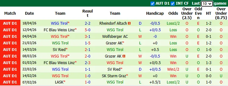 Thống kê phong độ 10 trận gần nhất của WSG Tirol