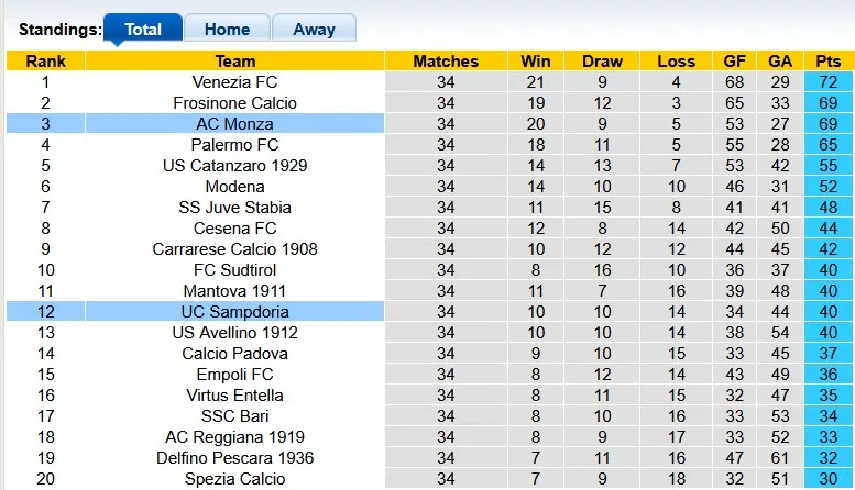 Giai đoạn cuối mùa giải, Sampdoria đã vùng lên mạnh mẽ và có được 3 chiến thắng liên tiếp gần đây. Nhưng điều đó chẳng thể giúp cho đội chủ nhà sáng cửa trở lại Serie A hơn. Nhưng ở chiều ngược lại, họ đã có thể tự tin trụ hạng.