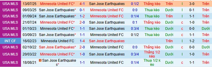 Thống kê phong độ, lịch sử đối đầu của San Jose Earthquakes vs Minnesota United