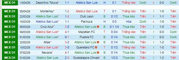 + San Luis thắng 3 hòa 1 thua 11 trong 15 trận gần nhất trên sân nhà theo kèo châu Á.