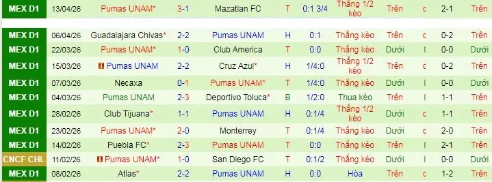 + Pumas UNAM thắng cả 4 trận mới nhất trên sân khách theo kèo châu Á.