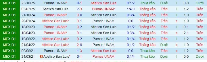 + San Luis thắng 6 hòa 1 thua 11 trong 18 trận đối đầu với Pumas UNAM.