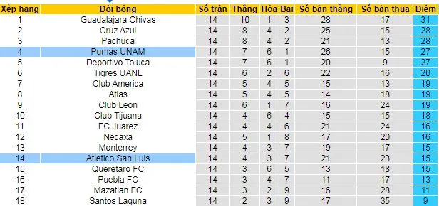 Thống kê phong độ, lịch sử đối đầu của San Luis vs Pumas UNAM
