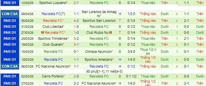 + 7/11 trận gần đây của Recoleta cũng có 2 bàn thắng trở xuống.