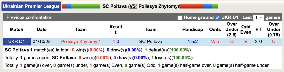 Thống kê phong độ, lịch sử đối đầu của SC Poltava với Polissya Zhytomyr