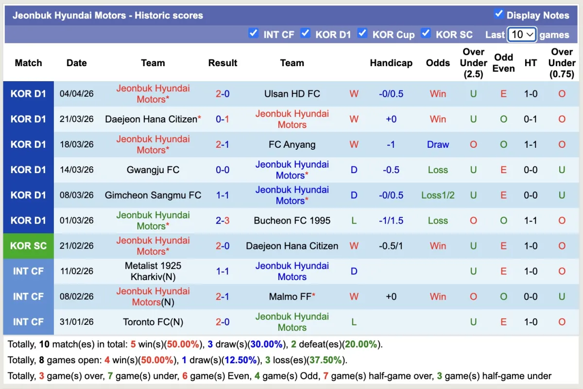 -Thống kê phong độ 10 trận đấu gần nhất của Jeonbuk Hyundai Motors