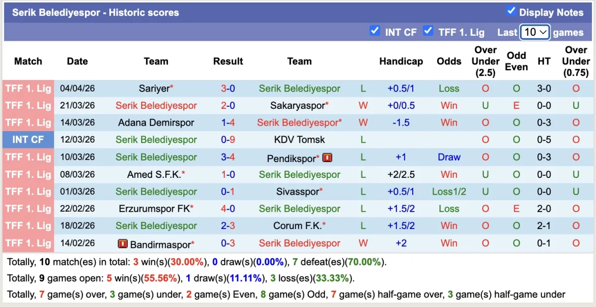 -Thống kê phong độ 10 trận đấu gần nhất của Serik Belediyespor