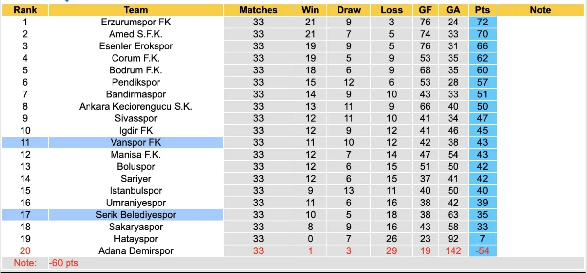 Sau 2 vòng đấu liên tiếp giành chiến thắng, Serik Belediyespor đã làm các cổ động viên của mình thất vọng khi bất ngờ ngã ngựa với tỉ số 0-3 trên tổ ấm trước Serik Belediyespor. Với 35 điểm họ đang nằm nhóm xuống hạng.