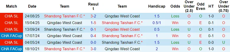Lần gần nhất Shandong Taishan tiếp đón Qingdao West Coast thuộc giải VĐQG Trung Quốc diễn ra vào tháng Tám năm ngoái. Shandong Taishan khi ấy hạ Qingdao West Coast trong màn so tài xuất hiện tới 5 bàn thắng, với tỷ số 3-2.