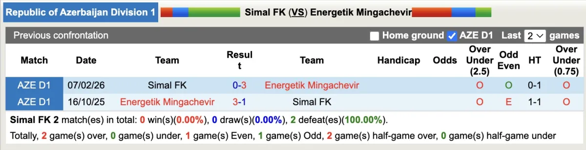 Thống kê phong độ, lịch sử đối đầu của Simal với Energetik Mingachevir