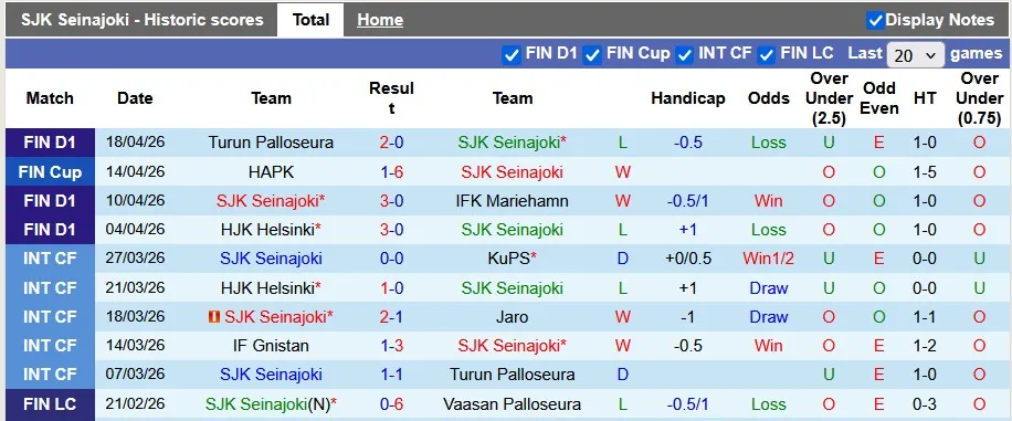 Thống kê phong độ 10 trận đấu gần nhất của SJK Seinajoki