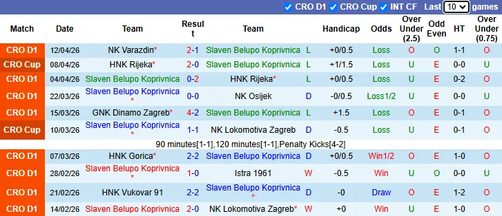Thống kê phong độ 10 trận gần nhất của Slaven Belupo