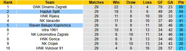 Phía đối diện, Hajduk Split đang đứng thứ 2 với 59 điểm, kém đội đầu bảng Dinamo Zagreb 10 điểm. Với việc giải đấu chỉ còn 7 vòng nữa là kết thúc, mọi trận đấu đối với Hajduk Split lúc này đều như một trận chung kết. Điểm mạnh của Hajduk Split chính là sự già dơ và bản lĩnh ở những thời khắc quyết định.