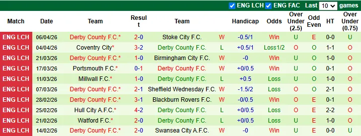 Thống kê phong độ 10 trận gần nhất của Derby County