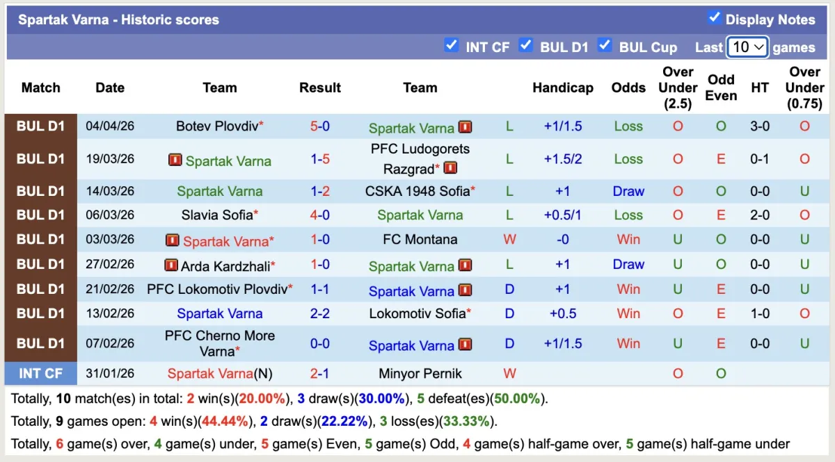 -Thống kê phong độ 10 trận đấu gần nhất của Spartak Varna