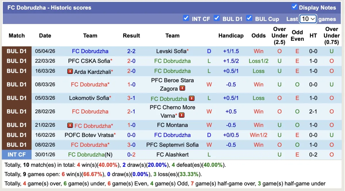 -Thống kê phong độ 10 trận đấu gần nhất của Dobrudzha