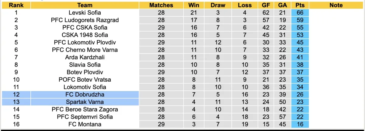 Bảng xếp hạng bóng đá Giải VĐQG Bulgaria 2026