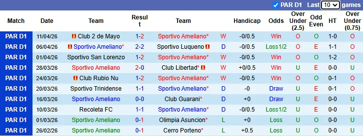 Thống kê phong độ 10 trận gần nhất của Sportivo Ameliano