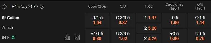 Sàn giao dịch châu Á ghi nhận mức kèo St. Gallen chấp 1 1/4 trái, cao nhất trong lịch sử đối đầu giữa hai đội, cho thấy các nhà đầu tư đang có niềm tin rất lớn dành cho đội chủ nhà. Tuy nhiên, với thành tích thua kèo châu Á 3/4 trận sân nhà gần đây, St. Gallen có thể sẽ gặp khó khăn trước Zurich, đội thắng kèo 2 trận gần nhất được chấp kèo tương tự.