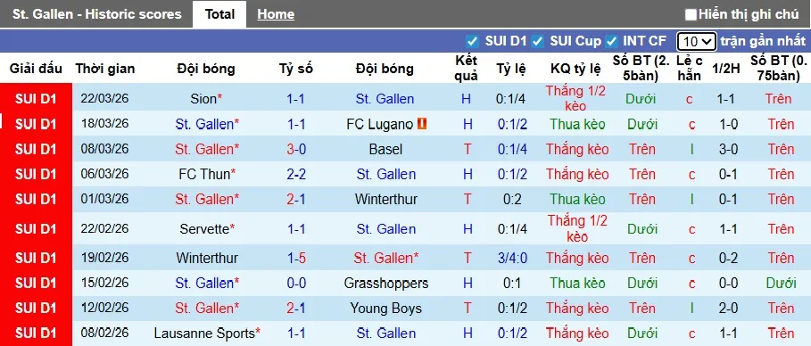 Thống kê phong độ 10 trận đấu gần nhất của St. Gallen