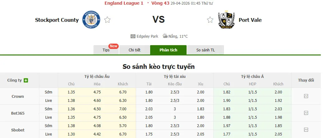 Nhận định soi kèo Stockport vs Port Vale, 01h45 ngày 29/4 tại hạng 2 Anh. Phân tích tỷ lệ kèo, dự đoán kết quả Stockport đấu với Port Vale từ tỷ lệ châu Âu, châu Á qua các chuyên gia hàng đầu.