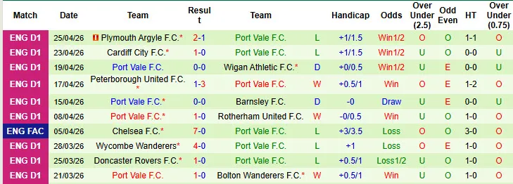 Thống kê phong độ 10 trận đấu gần nhất của Port Vale