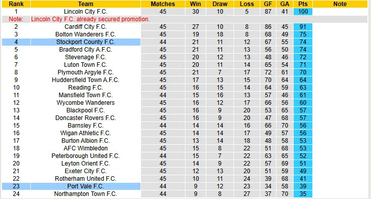 Mọi thứ càng thêm dễ dàng với Stockport khi đối thủ ở lượt trận đêm nay là cái tên hết động lực thi đấu Port Vale. Trên bảng xếp hạng giải hạng 2 Anh, Port Vale là đội bóng đứng ở vị trí thứ 23/24 đội tham dự và chính thức nhận vé xuống hạng. Sau 44 trận đã đá, Port Vale mới có được 39 điểm và kém đội an toàn tới 12 điểm. Đây là cách biệt không thể san lấp khi Port Vale chỉ còn 2 lượt trận nữa là khép lại mùa giải 2025/26. Phải thi đấu xa nhà và không còn động lực thi đấu, Port Vale không phải lựa chọn có thể tin tưởng.