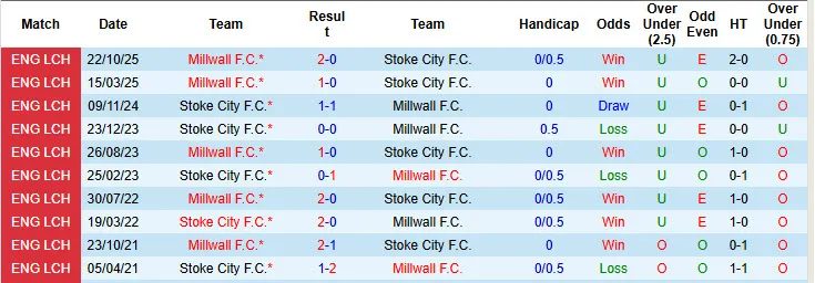 8 trận đối đầu vừa qua giữa Stoke vs Millwall có không quá 2 bàn thắng được ghi mỗi trận. 4 trận đấu mới đây của Stoke cũng có không quá 2 bàn/trận. 2 trận đấu gần đây của Millwall có tỷ số xỉu 2 1/2.