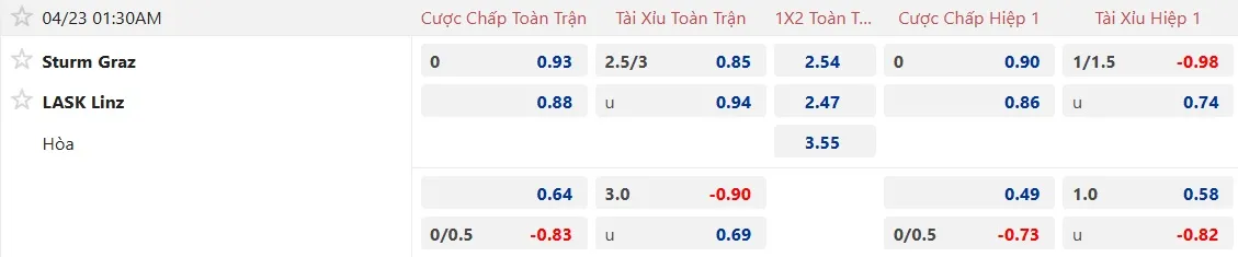 Nhận định soi kèo Sturm Graz vs LASK, 01h30 ngày 23/4 tại giải VĐQG Áo. Phân tích tỷ lệ kèo, dự đoán kết quả Sturm Graz vs LASK từ tỷ lệ châu Âu, châu Á qua các chuyên gia hàng đầu.