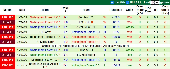 Thống kê phong độ 10 trận gần nhất của Nottingham Forest