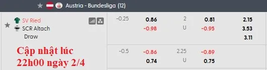 Nhận định soi kèo SV Ried vs Rheindorf Altach, 0h00 ngày 4/4 – Giải VĐQG Áo. Phân tích tỷ lệ kèo, dự đoán kết quả SV Ried đấu vs Rheindorf Altach chuẩn xác từ chuyên gia BongdaNET.