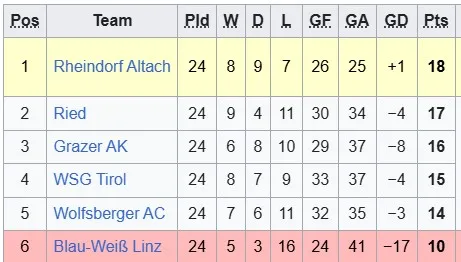 Bảng xếp hạng giải VĐQG Áo – nhánh trụ hạng