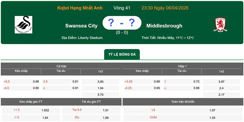 Soi kèo tài xỉu Swansea City vs Middlesbrough