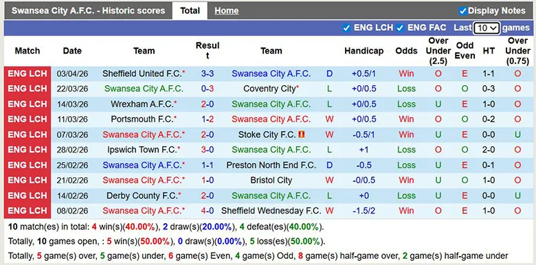 – Thống kê phong độ 10 trận đấu gần nhất của Swansea City