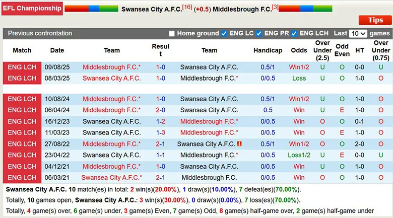 Middlesbrough có thành tích đối đầu rất tốt trước Swansea City. Trong 10 lần gần nhất đôi bên gặp nhau, Middlesbrough đã thắng 7 trận. Tỷ lệ thắng rất cao của Middlesbrough giúp họ đảm bảo lợi thế trong một trận đấu phải đá sân khách, đồng thời chấp bàn đối phương.