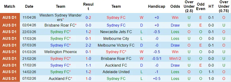– Thống kê kết quả 10 trận gần nhất của Sydney FC