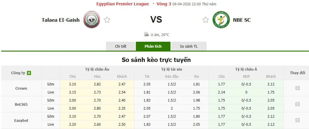 Nhận định soi kèo Tala’ea El Gaish vs National Bank of Egypt, 22h00 ngày 9/4 tại VĐQG Ai Cập. Phân tích tỷ lệ kèo, dự đoán kết quả Tala’ea El Gaish đấu với National Bank of Egypt từ tỷ lệ châu Âu, châu Á qua các chuyên gia hàng đầu.
