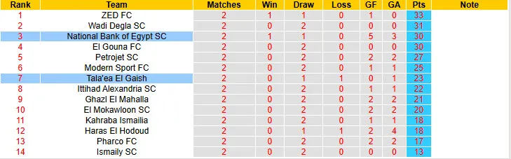 7/8 trận đối đầu vừa qua giữa Tala'ea El Gaish và National Bank of Egypt có không quá 2 bàn thắng được ghi mỗi trận. 4/6 trận đấu mới đây của Tala'ea El Gaish cũng có không quá 2 bàn/trận. 2/3 trận đấu mới nhất của National Bank of Egypt cũng có kết quả tương tự.