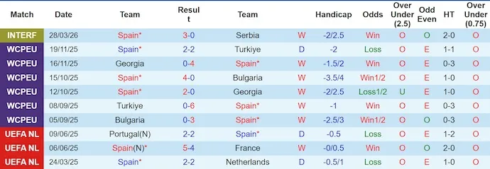 Phong độ gần đây của Tây Ban Nha vẫn duy trì ở mức cao với 8 chiến thắng, 1 trận hòa và chỉ 1 thất bại trong 10 trận gần nhất. Đáng chú ý, đội bóng này nhiều lần tạo ra những chiến thắng rất đậm như 6-0 trước Thổ Nhĩ Kỳ hay 4-0 trước Bulgaria.