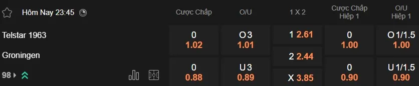 Sàn giao dịch châu Á ghi nhận mức kèo 0:0, tỷ lệ mà các cầu thủ Telstar rất có duyên, khi 2 trận đấu gần đây xuất hiện họ đều là những người giành chiến thắng và đều là các trận đấu họ có ưu thế sân nhà. Nếu tính xa hơn, Telstar đang có thành tích thắng kèo châu Á 7, hòa 1 và chỉ thua 1 trong 9 trận gần nhất.