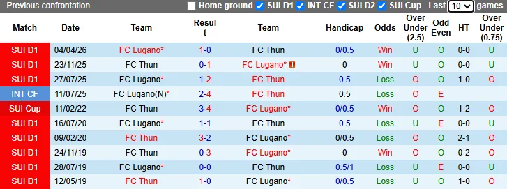 Thống kê phong độ, lịch sử đối đầu Thun vs Lugano