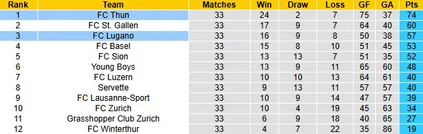 Với thành tích 24 chiến thắng và hàng công mạnh nhất giải (ghi 75 bàn), Thun đang tiến rất gần đến chức vô địch. Điểm tựa lớn nhất của thầy trò HLV Mauro Lustrinelli chính là sân nhà Stockhorn Arena, nơi họ đang sở hữu chuỗi 8 trận bất bại liên tiếp. Dù vừa để thua 0-1 trước chính Lugano hồi đầu tháng 4 nhưng với tinh thần đang lên cao, Thun quyết tâm phục hận để khẳng định vị thế số 1.