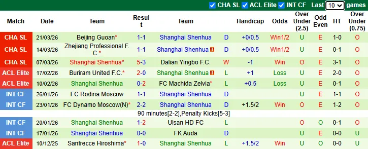 Thống kê phong độ 10 trận gần nhất của Shanghai Shenhua