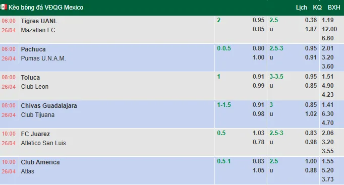 Trận cầu hấp dẫn tại giải VĐQG Mexico sẽ diễn ra vào lúc 6h00 ngày 26/4/2026, khi Tigres UANL đối đầu với Mazatlan. Cùng dudoanmacao.live phân tích và dự đoán kết quả trận đấu này thông qua tỷ lệ kèo châu Âu và châu Á từ các chuyên gia hàng đầu trong lĩnh vực bóng đá.