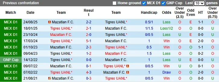 Thống kê phong độ 10 trận gần nhất của Tigres UANL và Mazatlan cho thấy sự chênh lệch về phong độ và đẳng cấp giữa hai đội.
