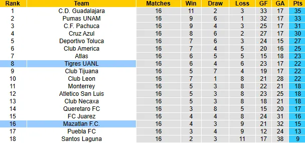 Phía đối diện, Mazatlan hiện đứng thứ 16 trên bảng xếp hạng với 15 điểm và đã mất cơ hội cạnh tranh suất đi tiếp. Tuy nhiên, tâm lý không còn gì để mất có thể biến họ thành một kẻ ngáng đường khó chịu. Chiến thắng kịch tính 4-3 trước Toluca ở vòng trước cho thấy hàng công của Mazatlan có thể bùng nổ bất cứ lúc nào với sự tỏa sáng của Luis Amarilla.