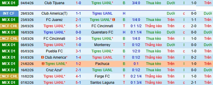 + Tigres UANL thắng 3 thua 7 trong 10 trận gần đây theo kèo châu Á.