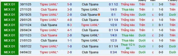 + Tijuana cũng thắng kèo châu Á 3/4 trận gần nhất tiếp đón Tigres trên sân nhà.
