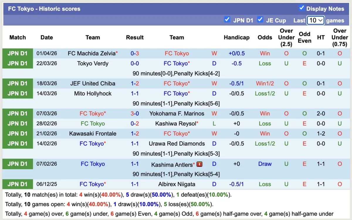 -Thống kê phong độ 10 trận đấu gần nhất của Tokyo